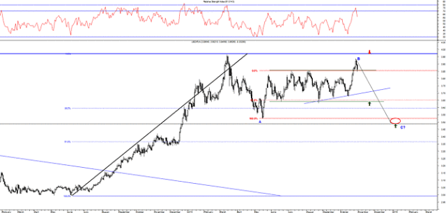 Z kolei zejście kursu poniżej poziomu 5,65 (linia trendu wzrostowego z genezą w czerwcu 2014 i 61,8% zniesienie odbicia z maja, czerwca i lipca) zmieniłoby trend na spadkowy w średnim terminie i pozwoliłoby na ruch przynajmniej do poziomu 5,43 (geneza na wykresie).